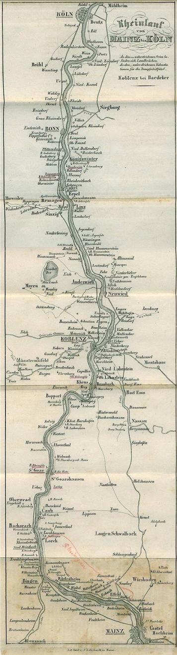 In the 1820s the tourist industry finally kicked in. The first touristy things that were published were panoramas of the Rhine. Those were folded maps of the river, usually with larger pictures of the the most important sights. The first one was created by Elisabeth von Adlerflycht after a journey on the Rhine in 1811, and was published in 1822 in Stuttgart. Three years later Friedrich Wilhelm Delkeskamp did another one for a publisher in Frankfurt. If you'd like to have a look at Delkeskamp's panorma or at his sights of the Rhine, you can find them all on the net at www.historic-maps.de. The explanations are given in both German and English. His panorama was sold together with a little booklet filled with explanations of the sights in German, English and French. But soon this didn't satisfy the tourists any longer -- and this was the birth of the modern guidebook for tourists. And the embodiment of the German guidebook is the Baedeker. Not surprisingly, one of his first guidebooks was Die Rheinreise ("Journey on the Rhine"), published in 1832, which had come out four years earlier at a different publishing house (on the right you can see part of the map of the Rhine included in the Baedeker guidebook; I found the picture on www.bdkr.com, a site run by collectors of old Baedekers). Baedeker's second guidebook was tailored more towards the needs of British tourists: The Traveller's Manual of Conversations was something like a English-German-French-Italian dictionary of important words and phrases.