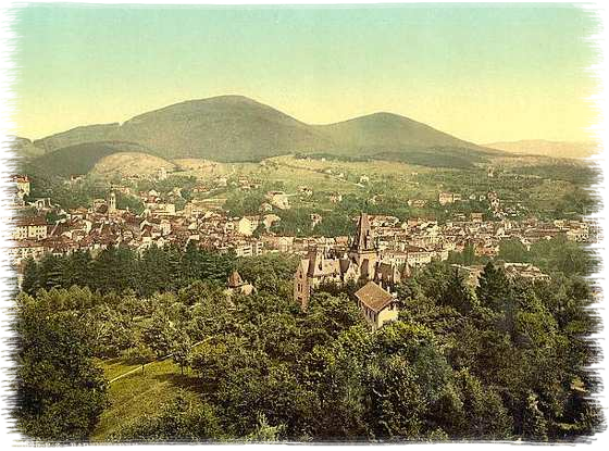 "There can be but one opinion as to the beauty of the situation of the town of Baden,embosomed among hills forming an offset or commencement of the Black Forest range, and seated on the banks of the Oes, a stream which, though insignificant in size, once formed the boundary line between the Franks and the Alemanni. The town has about 4500 permanent inhabitants, and is built chiefly on the slope of a hill, owing to the narrowness of the valley. The mineral springs were known to and appreciated by the Romans, who fixed a colony there, and called it Civitas Aurelia Aquensis. It was for 6 centuries the abode of the Margraves of Baden, who at one time deserted it for Rastadt in the flat plain of the Rhine: at present the Grand Duke of Baden occasionally visits his Villa here, but resides principally during the summer at his Castle of Eberstein. Baden was once considered one of the most fashionable German watering-places. . . . It has the greater attraction of being by far the most beautiful of all the baths of North Germany in its situation; even surpassing in this respect the Brunnen of Nassau. The surrounding country, without the sublimity and grandeur of Switzerland, is distinguished by a pleasing and romantic wildness; it is, as it were, a prelude to the Alps. The neighbourhood will afford almost endless gratification in the beauty of its prospects, and the number and variety of the rides and walks, cut for miles in every direction through the forests, and up the surrounding hills.
