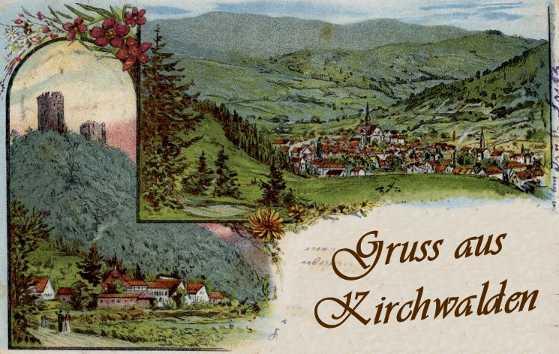 ". . . we entered the straggling, beauitfully situated town of Waldkirch, surrounded by romantic hills and heights, forest-crowned, ruin-crowned. On all sides were wooded slopes and grand undulations, which make Waldkirch one of the most picturesque spots in the Black Forest.